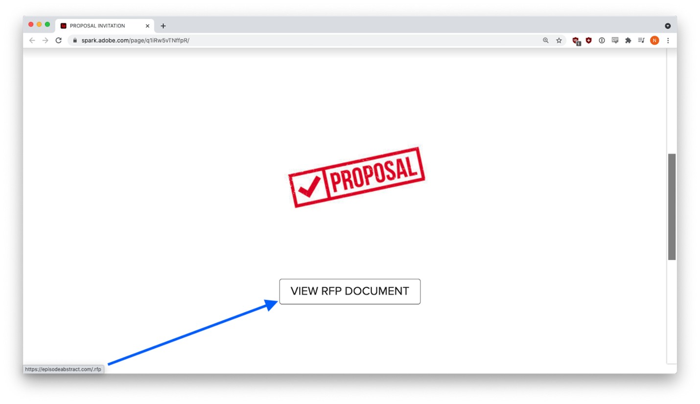 Each of these fake RFP emails was slightly different, but they all invited recipients to submit proposals on Adobe Spark via blue hyperlinks. Clicking the link would take the victim to a customized document on Adobe Spark. If the target was sophisticated enough, they might have hovered over the white “VIEW RFP DOCUMENT” button and seen the malicious link:
