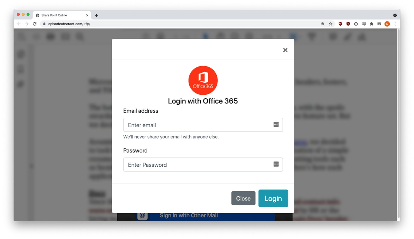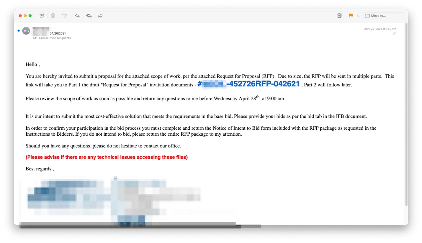 The following section contains three examples of Adobe Spark RFP attacks. In each one, phishers created customized documents on spark.adobe.com and sent from hijacked accounts phishing emails with fake RFPs to known contacts. The phishing emails all had links to the Adobe site, where credential harvesting links awaited the hapless victim.