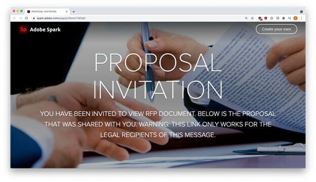 Again, the phisher did not make any usage errors in this foray. The pitch was clean, simple, and only mildly urgent. Under the View Proposal button, was a link that led to a booby-trapped Adobe Spark site.